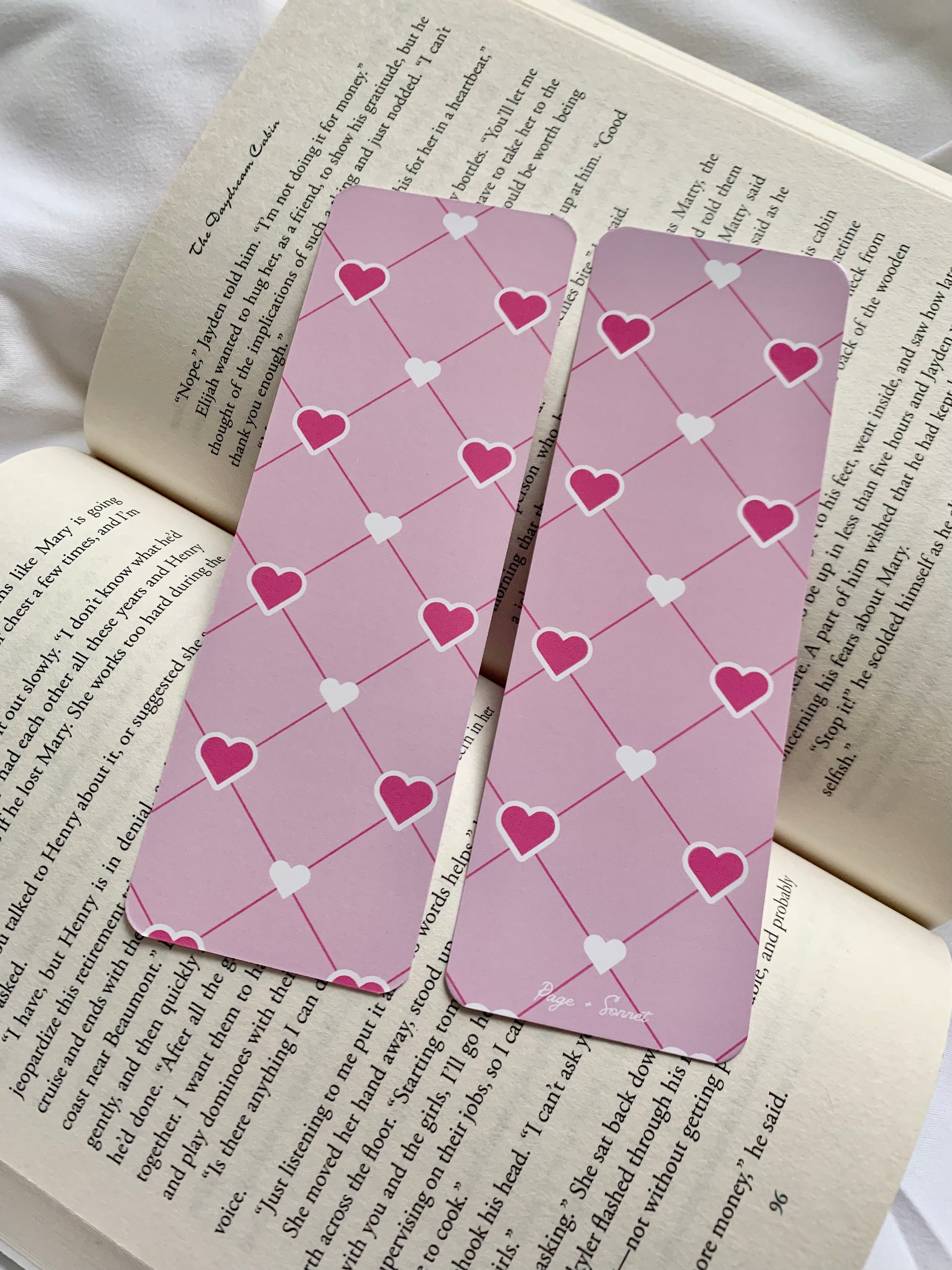 Add a touch of soft romance to your reading ritual with the Sweetheart Bookmark, a tender little treasure designed to make every chapter feel sweeter than the last. Its gentle light pink background is wrapped in a delicate crisscross lattice pattern, each intersection adorned with charming white and hot-pink hearts that create a playful, love-soaked design.